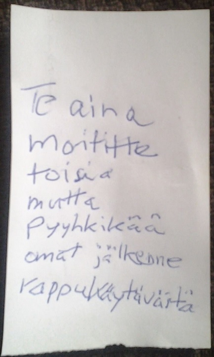 Huomioitavaa on siis sen että olen aina laittanut nimeni ja puhelinnumeroni jokaiseen lappuun jotta muut voivat olla yhteydessä jos näin haluaa. Tänään sit kotiin tultaessa oli meidän postiluukusta pudotettu lappu missä pyydettiin siivoamaan rappukäytävässä olevat jäljet pois. Kyseessä oli hiekkajäljet lastenrattaista jotka olivat hissiltä meidän asunnon ovelle. Lappu oli…yllätys yllätys nimetön, ja valitettavasti se oli kirjoitettu monikko muodossa “te kun aina moititte…”. Olisikin mukava tietää miksi ne kirjoittavat nimettömänä ja miksi monikko muodossa, ikään kuin olisimme usein moittineet muita.