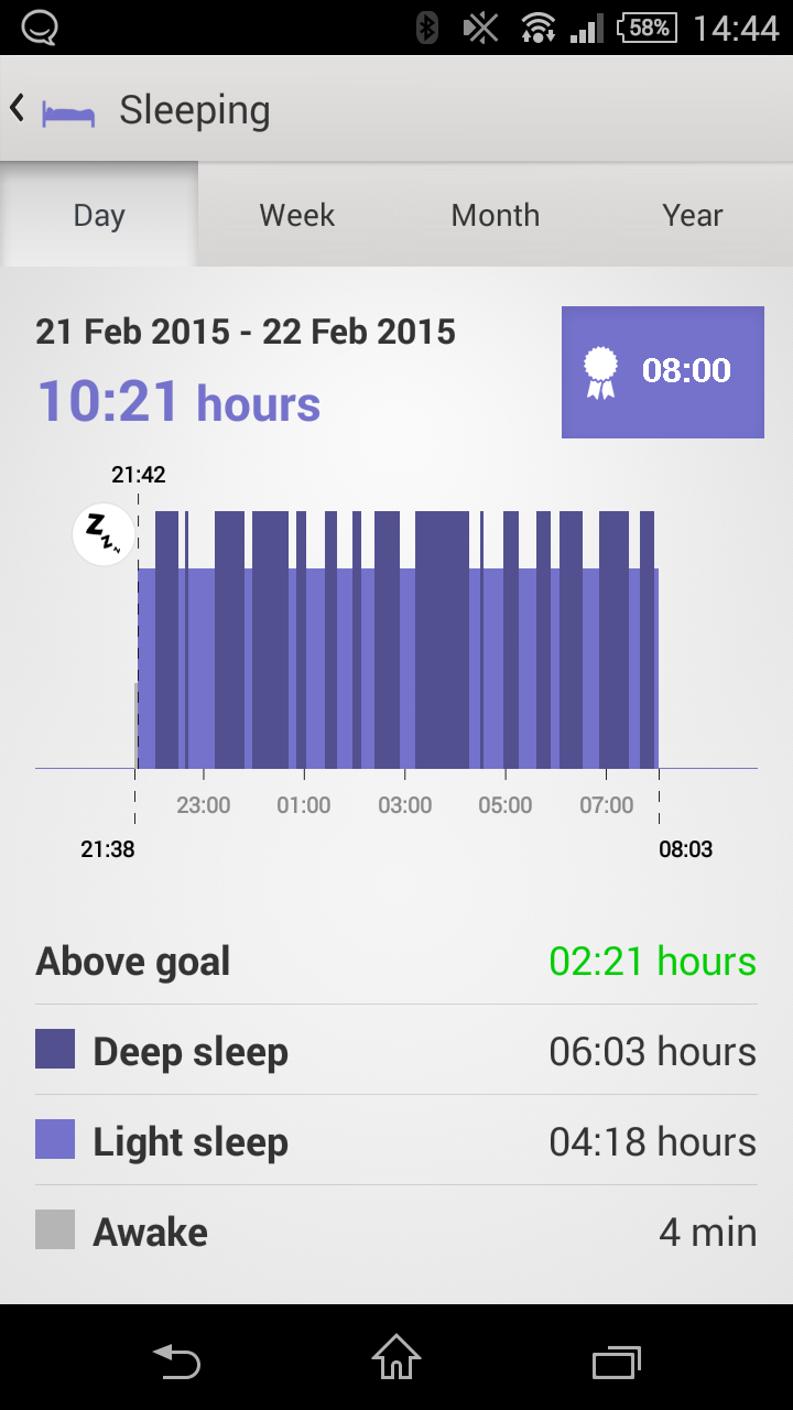 Onhan tässä muistettava että kaikki nämä ajat eivät ole absoluuttisia, vaan suuntaa antavia, varsinkin tuo syvä/pinta-uni, mutta yllättävän tarkkoja nämä laitteet voivat olla. Itselläni siis on käytässä Sony SmartBand SWR10 sekä Sony Lifelog sovellus. Nappia painamalla merkataan laitteistolle onko kyseessä yö vai päivä. Vaikka olenkin löytänyt muutamia kehityskohteita tuohon Lifelog sovellukseen olen siihen todella tyytyväinen. Se joka on mielestäni todella tärkeä ja todella hyvin toteutettu on akunkesto. Tuo itse mokkula mikä on rannekkeessa kestää todella hyvin luvatut 5 vuorokautta, välillä jopa vähän pitempään. Joten jatkuvasti ei tarvitse olla latailemassa. Tiedonsiirto puhelimeen ja sovellukseen siirtyy itsestään langattomasti Bluetoothin kautta. Ja mikäli haluaa sitä akkuaikaa pidentää voi linkin puhelimen ja rannekkeen väliltä katkaista, koska ranneke tallentaa sitä itsekseen ja kun se saa yhteyden uudestaan synkkaa se tiedot itsestään pois.