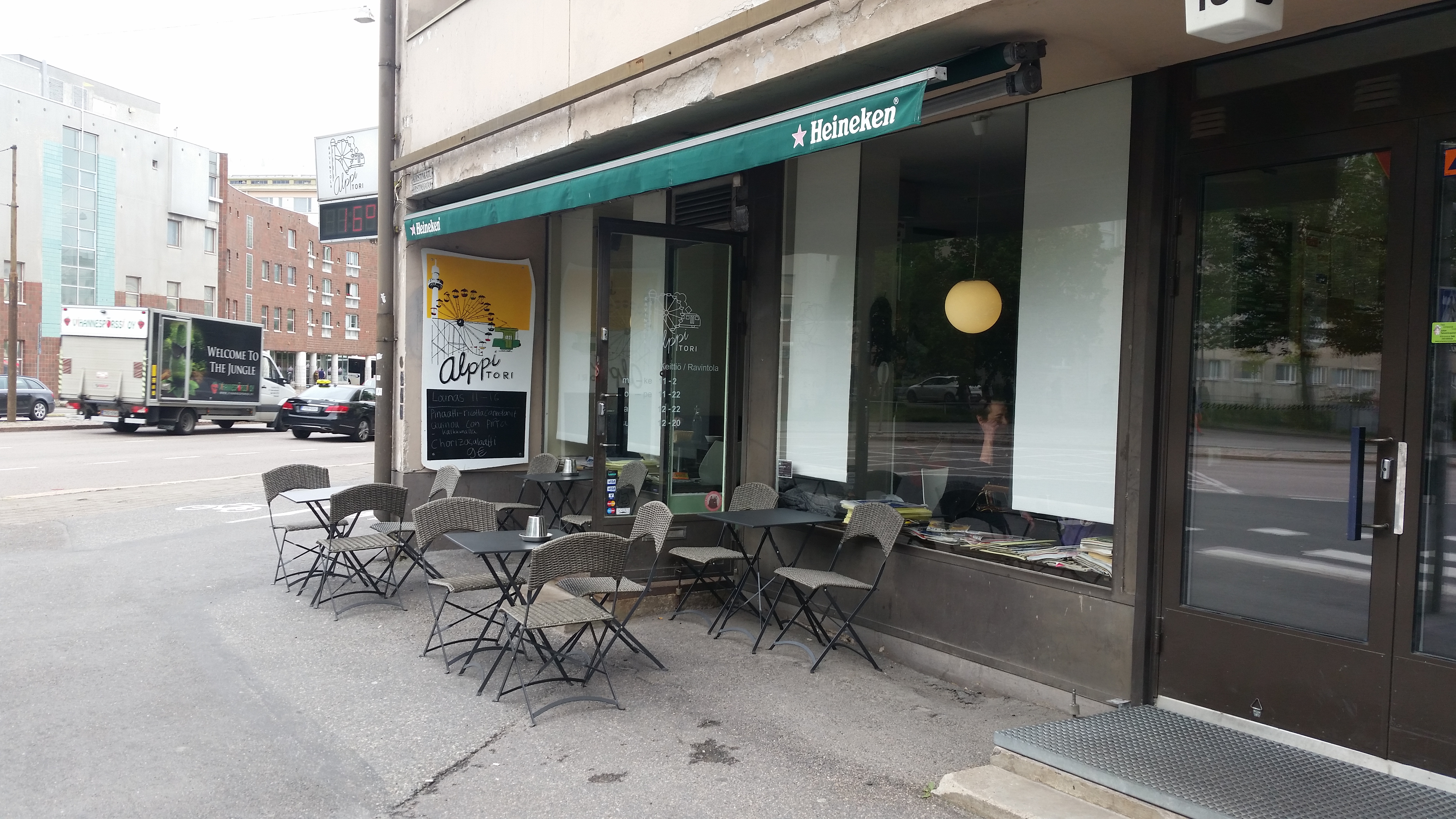 Ulkoa katsottua paikka näyttää ensin vähän kahvilalta, mutta ulkoseinällä oleva lounaslistaa katsoessa ilmenee että kyllä se ravintola on. Paikan nimi siis Ravintola AlppiTori, ja se löytyy Kirstinkatu 15:sta.