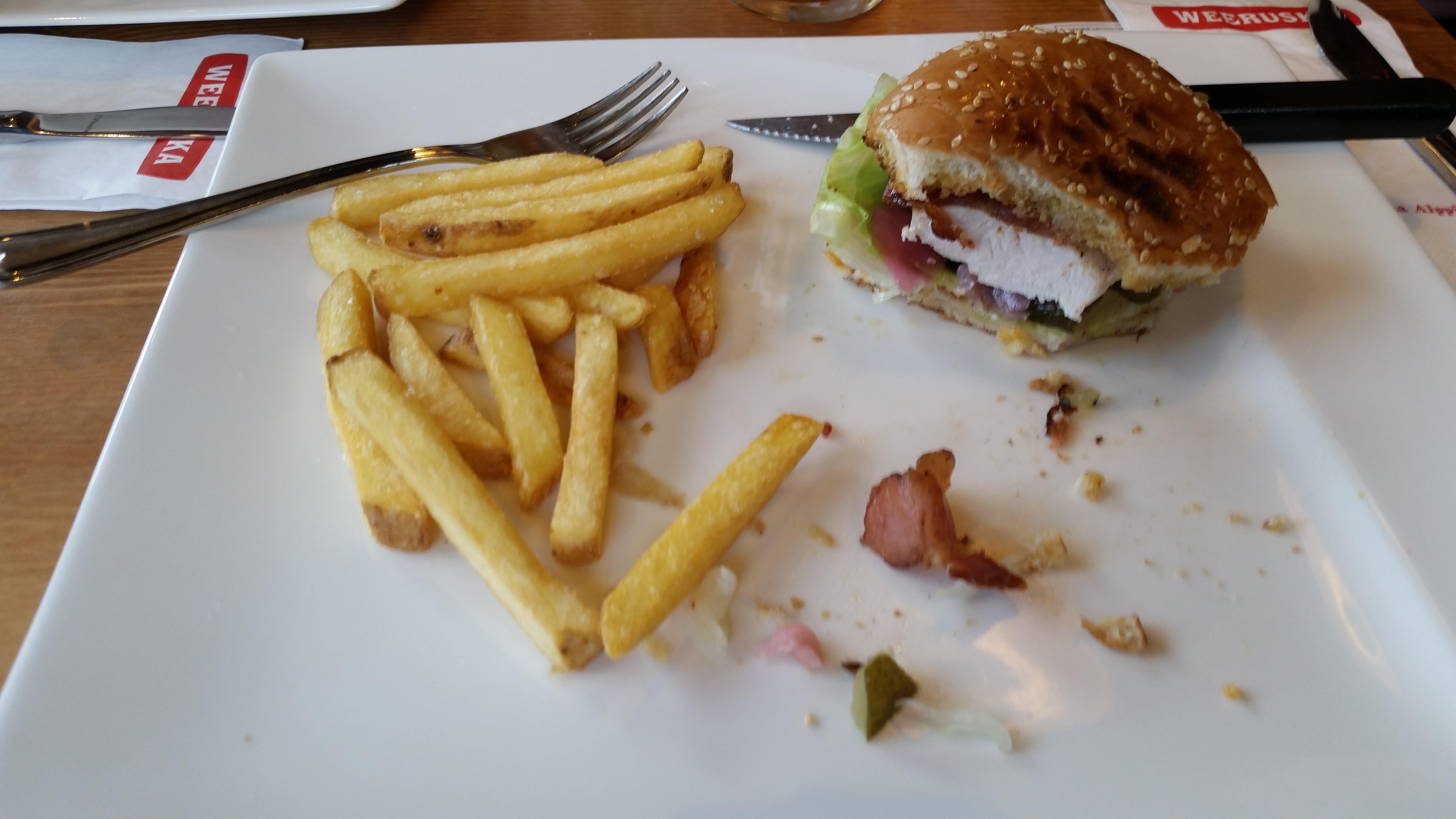 Nälkä oli suuri ja annos niin hyvännäköinen, itse asiassa se oli niin suuri että unohdin ottaa kuvan ateriasta kun se oli vielä koskematon, joten siksi tähän joudun liittämään “vähän syödyn” kuvan, mutta samalla tulee nähtyä myös tuo kanapihvin reilu koko, joten jotain hyvääkin. Hyvänä yksityiskohtana oli myös se että aterian mukana toimitettiin kunnon veitsi, veitsi joka useassa paikassa tulee vain silloin jos ottaa jotain kunnon pihviä, joten tästäkin plussa Weeruskalle.