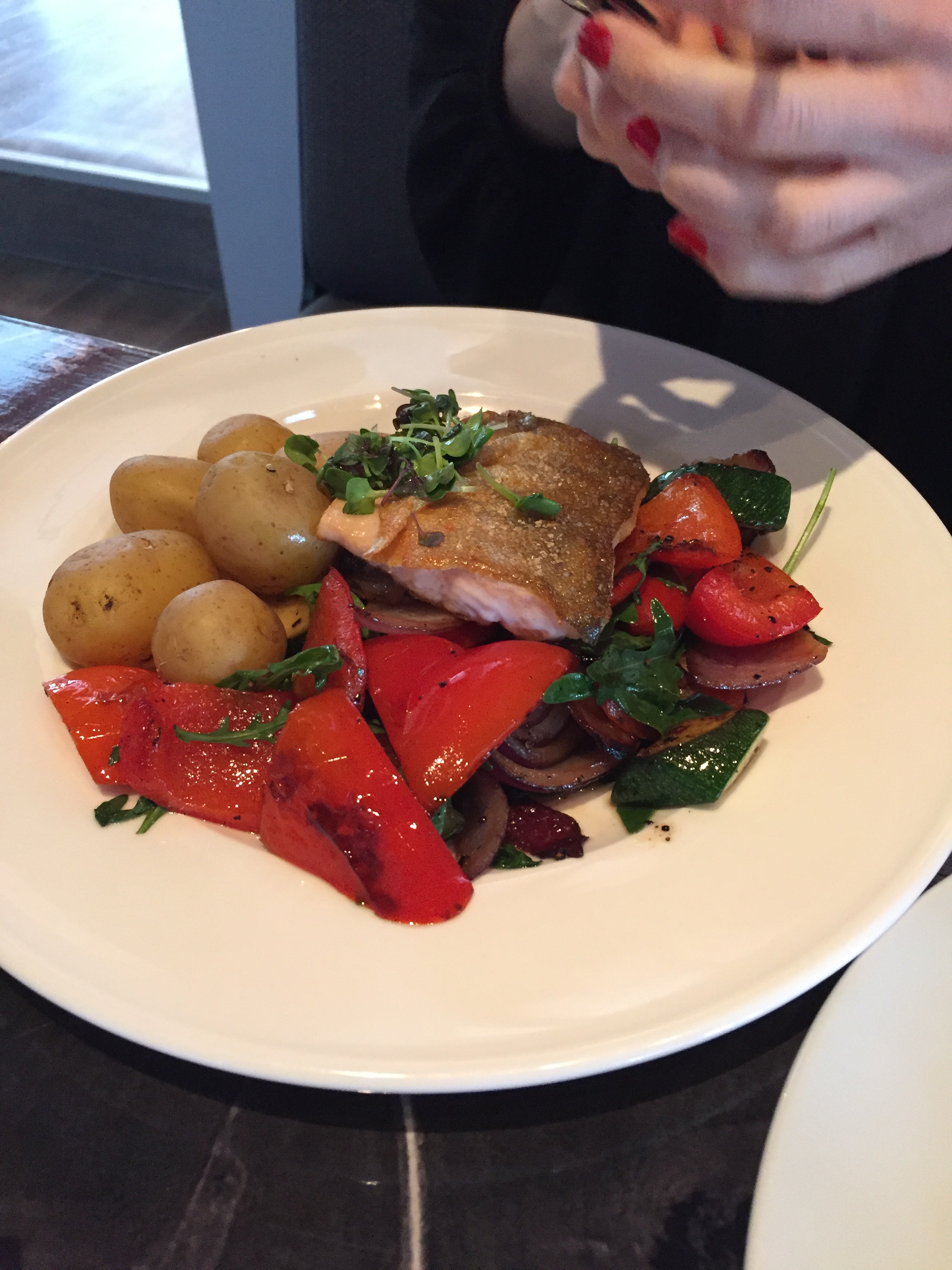 aikaisemmin yhteydessä ravintolaan ja ilmoittanut erikoisruokavaliosta, ja sähköpostiin vastattiin nopeasti ja kohteliaasti. Nyt tosin oli käynyt pieni kommunikaatiokatkos ravintolapäällikön ja keittiön välillä, eikä keittiö ollut ihan valmis, vaikka olinkin ilmoittanut kellonajan milloin saavumme. Tämä ei kuitenkaan aiheuttan mitään ongelmaa koska asia hoitui nopeasti ja vaivattomasti kuntoon. Vaimoni sai paistettua nieriää, keitetyt perunat sekä paistettuja kasviksia.