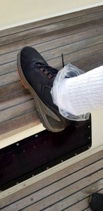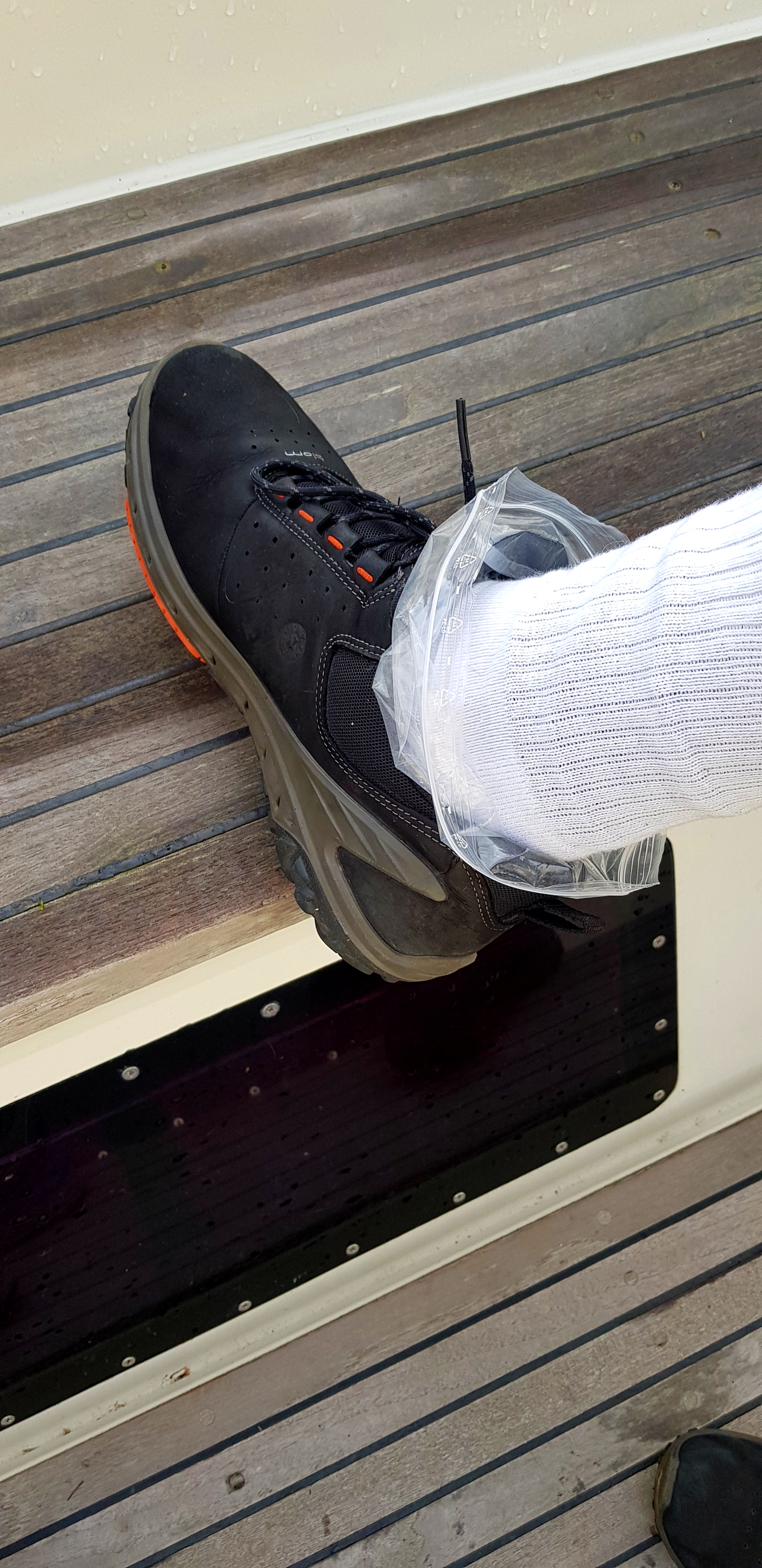 The next morning started on my part with some unexpected action. When I was getting of the boat, and stepped onto the pier. The board cracked under me, and my whole leg fell thru. Halfway up to my knee went into the sea, and not even my Gore-Tex shoes could save me from getting a wet foot. Luckily no injury was sustained, but the pier is going to need a new board. As I didn’t have any extra shoes with me, we had to get creative to keep my foot dry.
