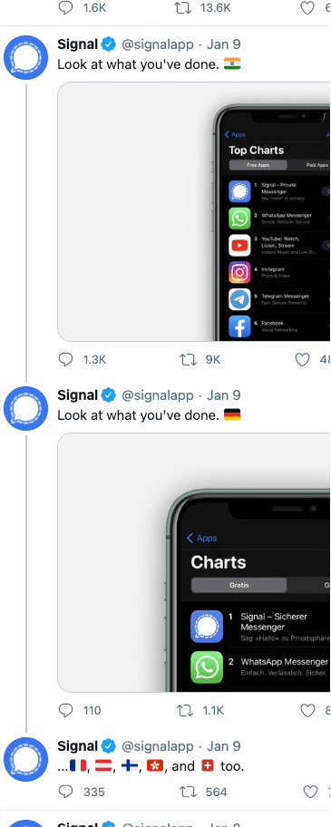 Signal seems to have gained very noticeably traction, as it’s at the moment of writing this blog post is the “Top free apps” -list leader. And it’s not only in Finland. Germany, France, Austria and others. Check out the tweets by Signal on January 9th.