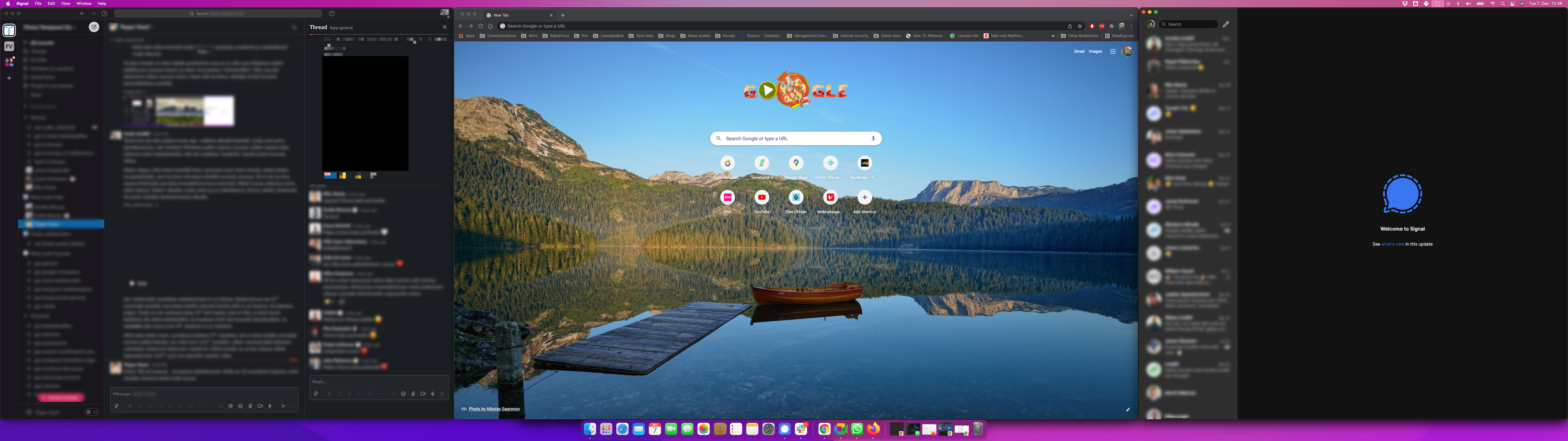 Example, I keep Slack open at all times on the left side, taking a little less of 1/3 off the screen, and then have two browser windows open on the rest, and therefore the main window in straight in front of me. And boy did this pay out BIG for me. I LOVE it! ❤